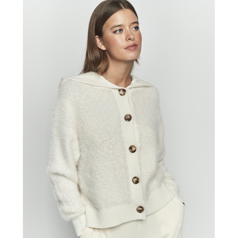 Casaco curto de mulher com capuz e botões frontais. Ideal para se manter quente e com estilo neste inverno.