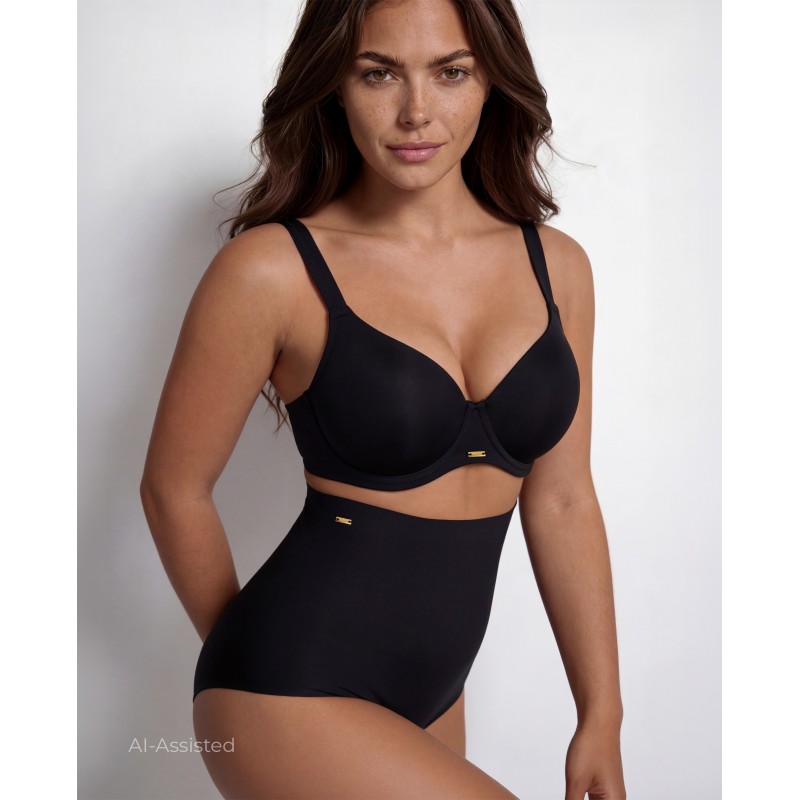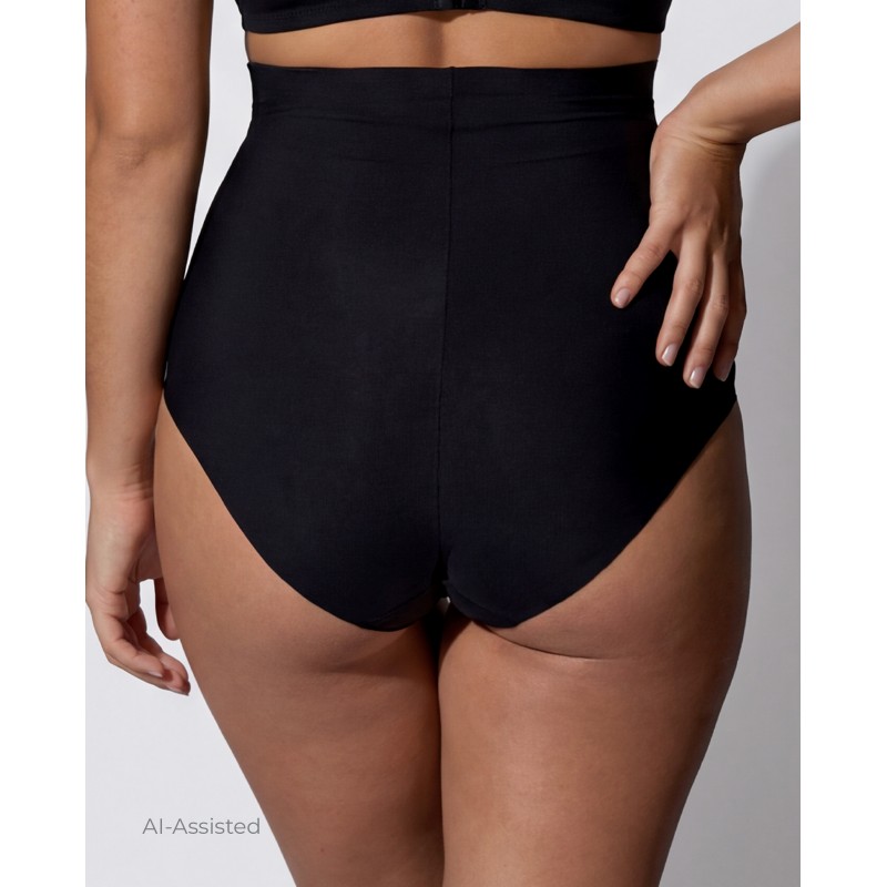 Cinta alta. Moldar e reduzir a figura. É uma peça básica com um conforto extra.
