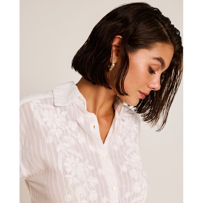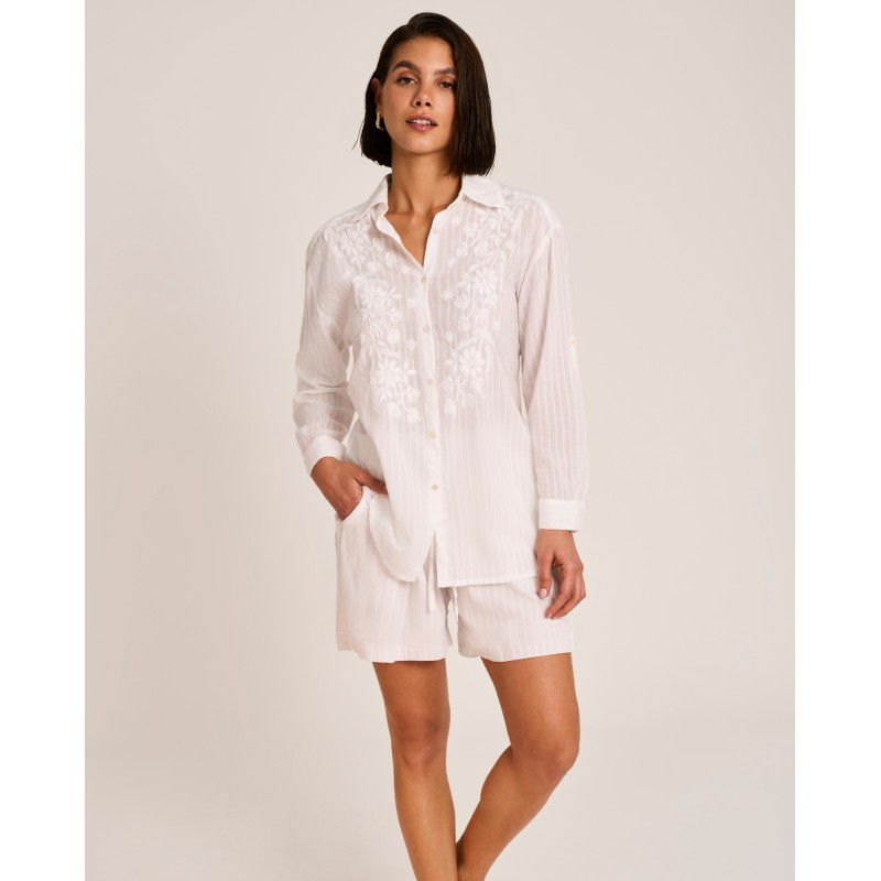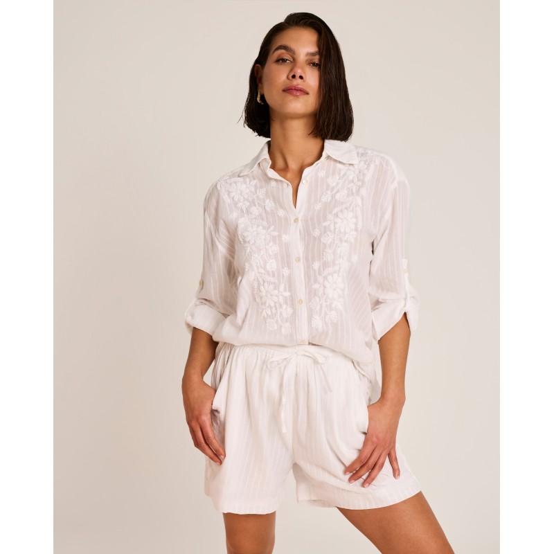 Conjunto de duas peças composto por uma camisa de manga comprida bordada com botões e calções com cordões ajustáveis. Um conjunto leve, pensado para um look fresco e natural.