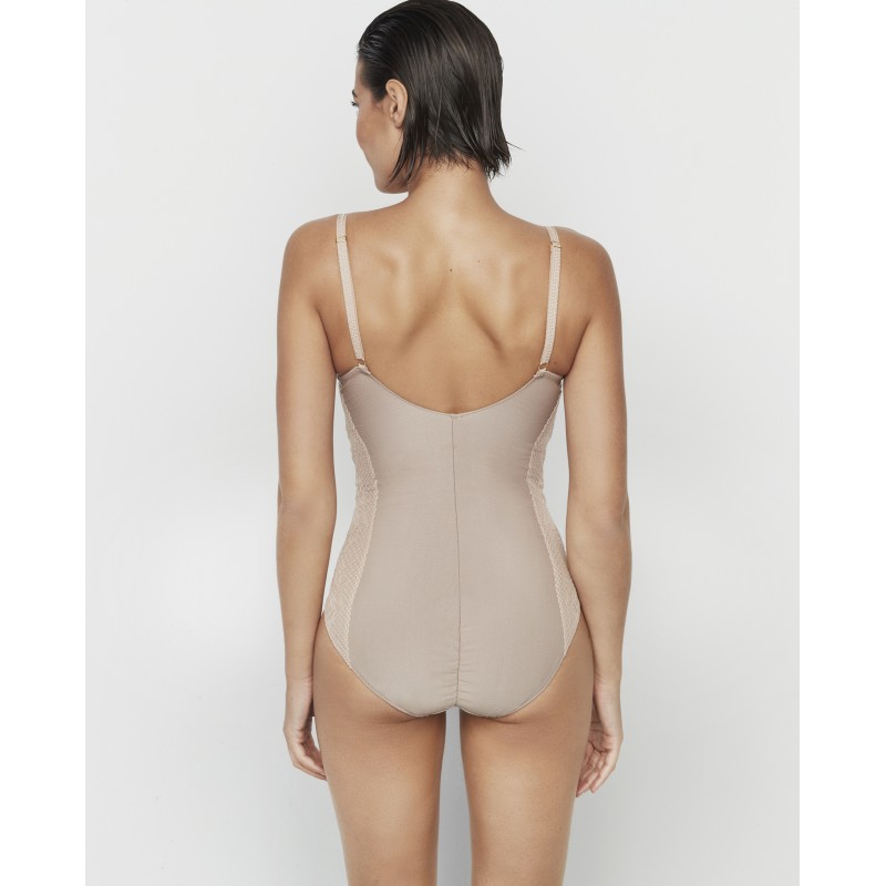 Body modelador com detalhes em renda floral nas laterais. Possui copa em tule pré-fabricado e interior forrado para máxima sustentação. Possui aro e base. Sem bojo de espuma. Dois tamanhos de pega disponíveis. Modela a silhueta sem abdicar do conforto e do estilo. A coleção Malitzia, à qual pertence, representa uma dança perfeita entre o delicado e o ousado.