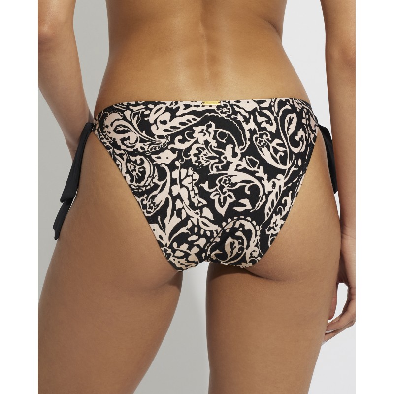 Cueca de biquíni de cintura baixa com nós para ajuste. Este design apresenta um padrão refinado e estilizado que destaca seu bom gosto e elegância.