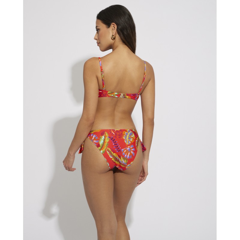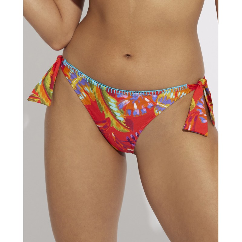 Cueca de biquíni de cintura baixa com nós para ajuste. Com uma estampa colorida e vibrante que vai dar frescor e vida aos seus dias de praia ou piscina.