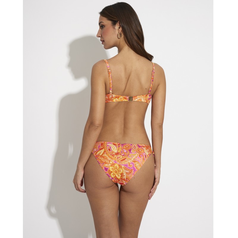 Cueca de biquíni de cintura baixa com nós ajustáveis. O seu design étnico confere-lhe um toque de originalidade e estilo único, tornando esta peça diferente das outras. Suas cores vibrantes destacam suas curvas de forma sutil, mas impactante.
