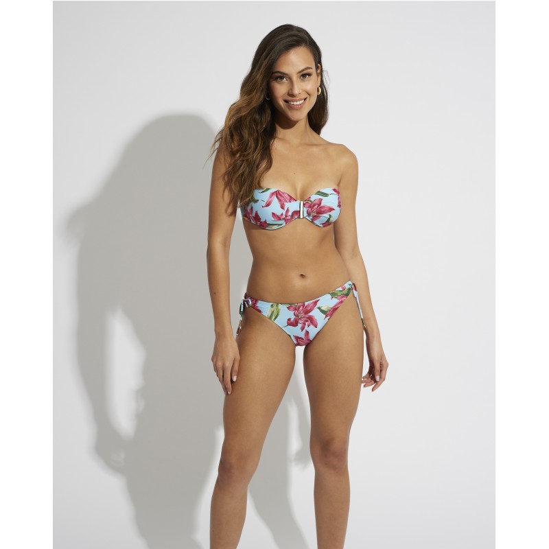 Cueca de biquíni de cintura baixa com nós ajustáveis. Com estampa tropical que evoca a beleza de uma ilha paradisíaca. A sua cor e frescura transmitem a alegria e a energia da estação mais esperada do ano.