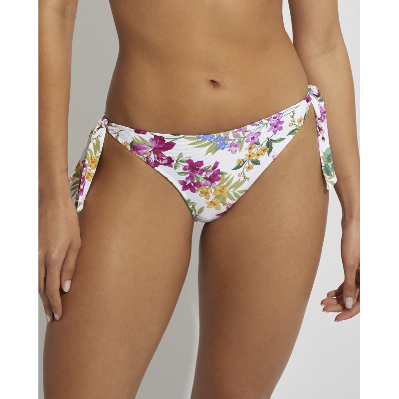 Cueca de biquíni de cintura baixa com nós ajustáveis. Este design floral e colorido é perfeito para parecer radiante e vibrante na praia ou piscina neste verão.