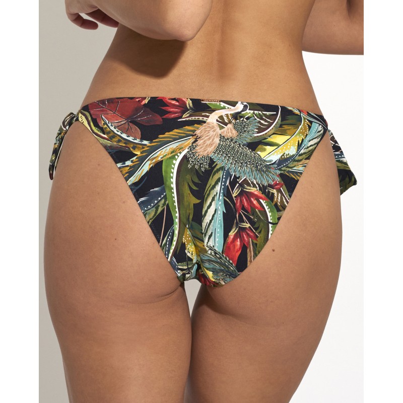 Cueca de biquíni de cintura baixa com nós ajustáveis. Este design espetacular com tons vibrantes inspirados na flora e fauna selvagens reflete a exuberância e vitalidade da natureza tropical selvagem.