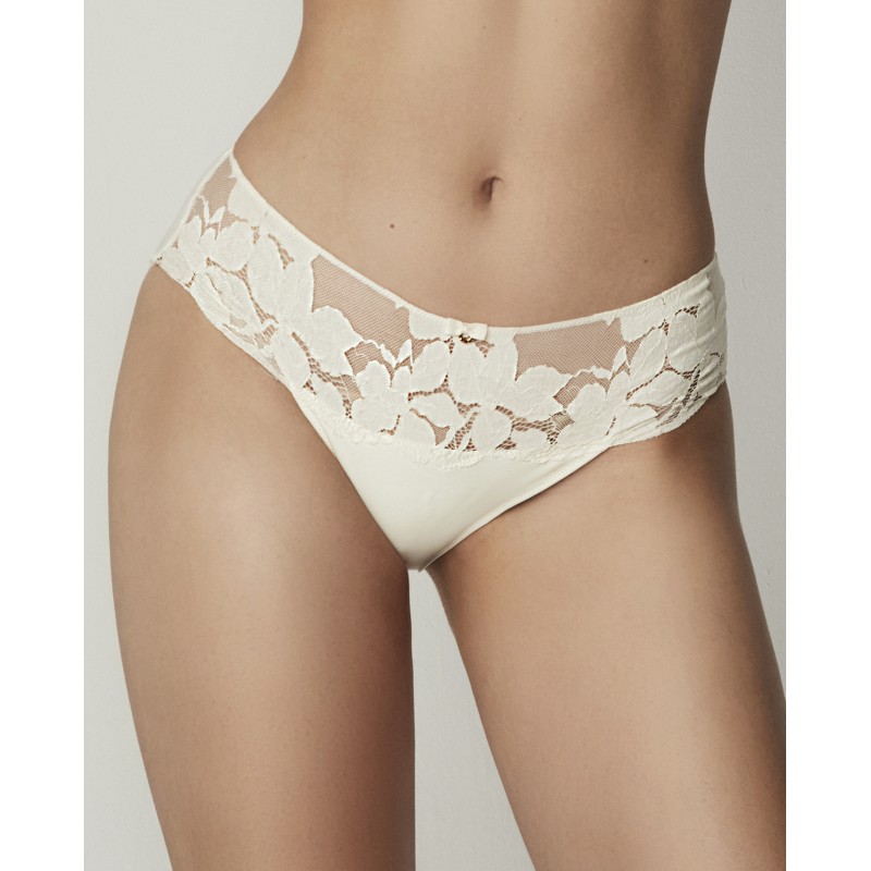 Cueca de biquíni de corte clássico com renda floral combinada com piqué, que proporciona suavidade, criando linhas limpas e detalhes requintados. O elástico na cintura não marca. Uma peça de lingerie sofisticada onde a elegância e o conforto andam de mãos dadas. A coleção Federica, à qual pertence, caracteriza-se por formas e estruturas trabalhadas com precisão para melhorar os contornos de cada mulher e aumentar a sua confiança, celebrando o individualidade e feminilidade no seu melhor.