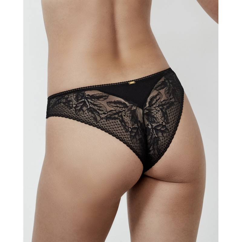 Cuecas com corte brasileiro e renda floral que se estende da frente para trás, acrescentando suavidade e detalhes requintados à peça. O cós elástico proporciona um efeito que não marca. A coleção Malitzia, à qual pertence, representa uma dança perfeita entre o delicado e o ousado.