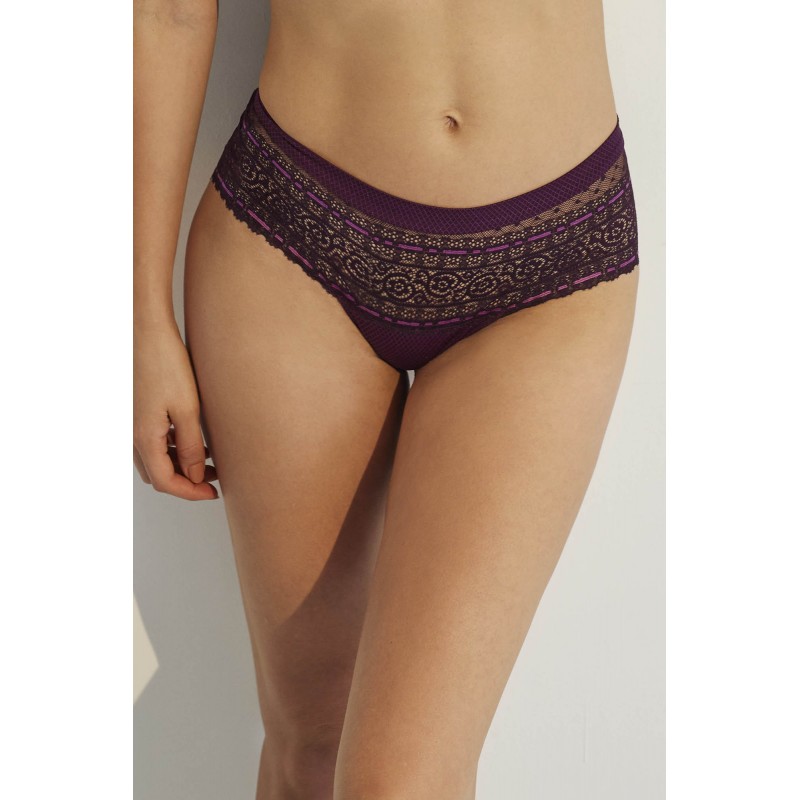 Cueca culotte muito confortável e versátil, confeccionada com materiais de alta qualidade. Possui um delicado padrão geométrico e o acabamento da renda a torna uma peça extremamente feminina.