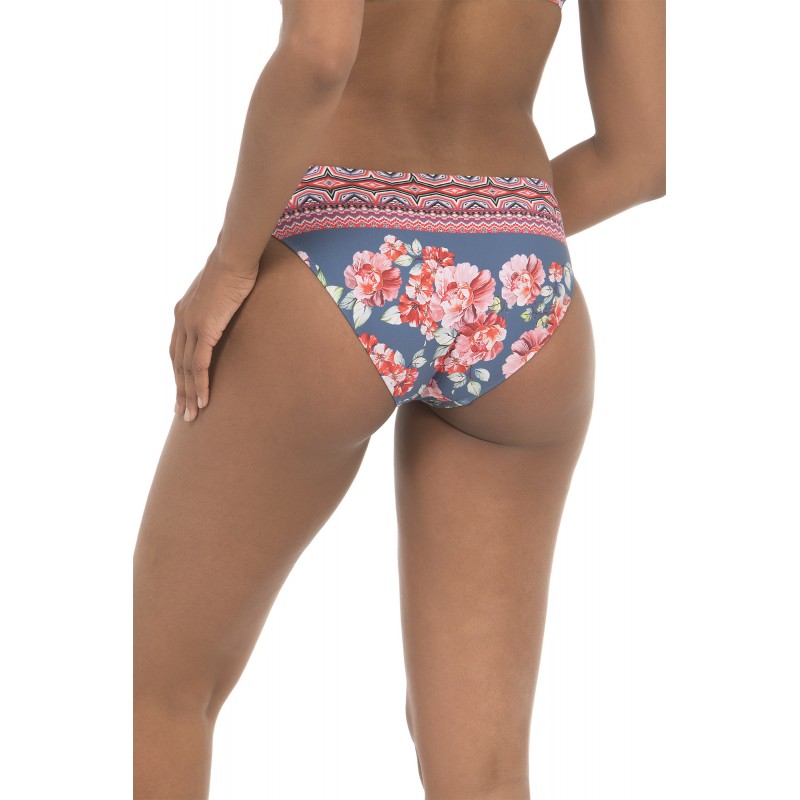 Cueca de bikini de corte clássico. Com estampado de "greca" colorido. Em azul.
