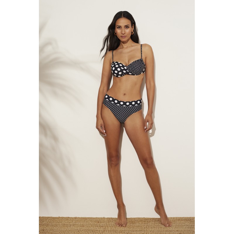 Cueca de bikini com corte clássico. Com um design diferenciado que combina duas estampas de bolinhas que a torna uma peça de banheiro bem colorida, ideal para este verão.