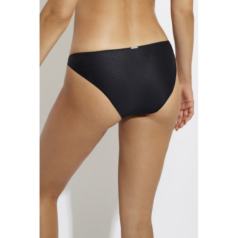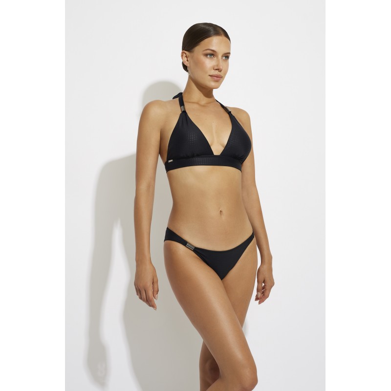 Cueca de bikini de cintura baixa com nós ajustáveis. Com um detalhe que traz elegância a esta peça. Uma alternativa ideal entre os seus fatos de banho.