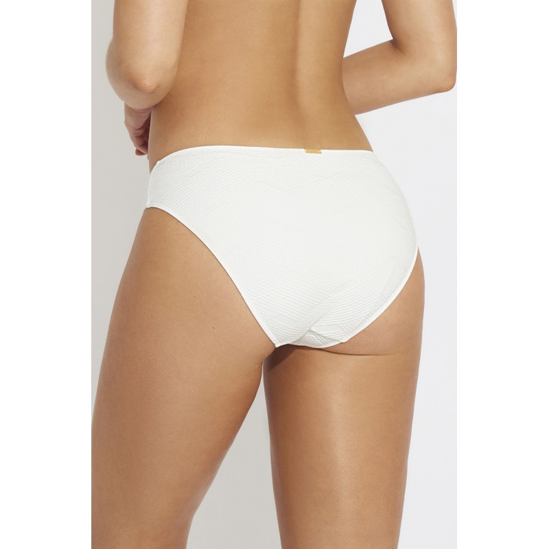 Cueca de bikini de cintura baixa com nós ajustáveis. Confeccionada com tecido reciclado, a peça é uma excelente alternativa entre os trajes de banho neste verão.
