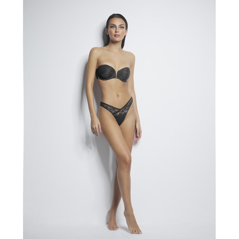 Cueca tanga com delicados detalhes em renda. Esta peça é uma promessa de momentos especiais, um toque de mistério e sedução que transforma o poder da feminilidade na sua forma mais refinada e cativante.