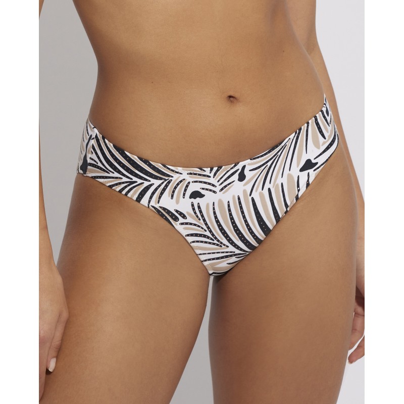 Cueca de biquíni com corte clássico. Essa estampa é a escolha ideal para quem procura um look tropical e fresco. As folhas de palmeira representam o exotismo e a beleza dos trópicos, transmitindo uma sensação de escapismo e liberdade.
