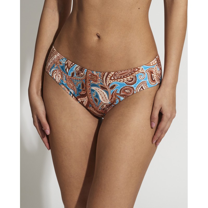 Cueca de biquíni com corte clássico. O seu design étnico confere-lhe um toque de originalidade e estilo único, tornando esta peça diferente das outras. Suas cores vibrantes destacam suas curvas de forma sutil, mas impactante.