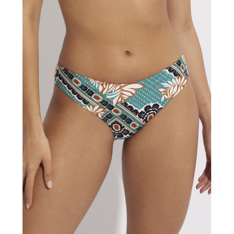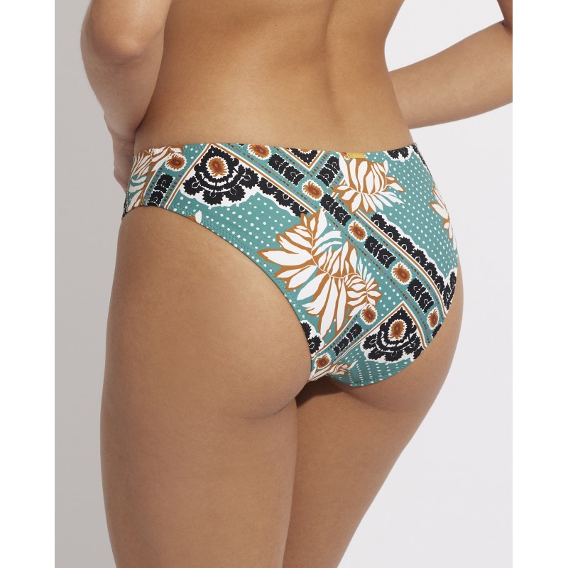 Cueca de biquíni com corte clássico. Com um design que combina a feminilidade das flores e a estrutura das formas geométricas, criando um equilíbrio visualmente atraente. Esse contraste garante que seja uma peça marcante e que se destaque de outros designs mais convencionais.