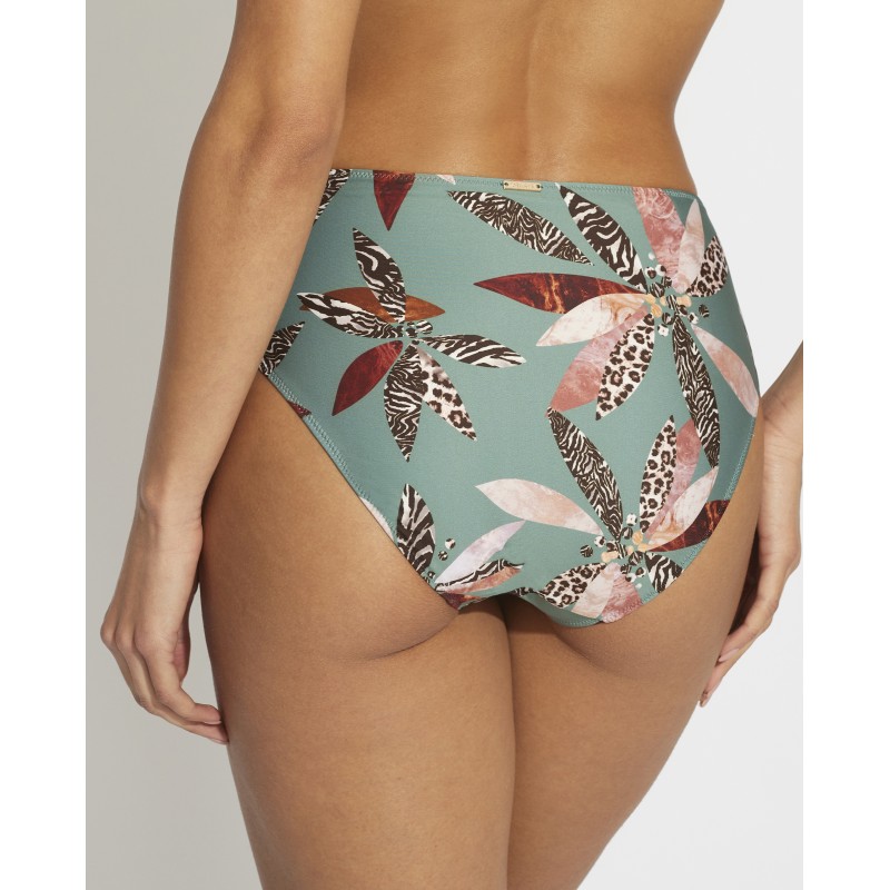 Cueca de biquíni de cintura alta com corte clássico. Sua estampa selva transmite sensação de frescor, alegria e exotismo. É uma peça perfeita para exibir um estilo selvagem e tropical na praia ou na piscina.