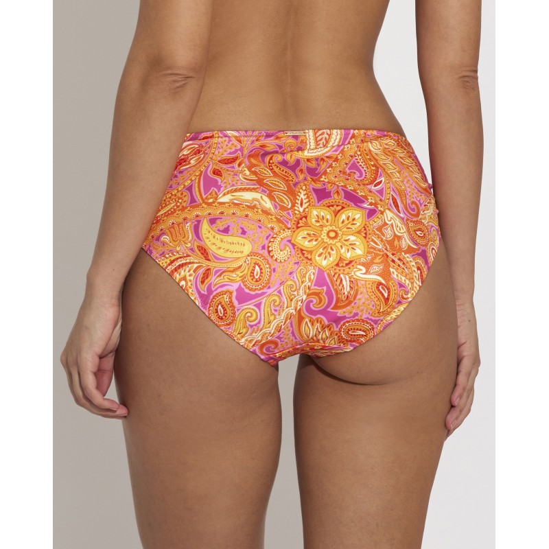 Cueca de biquíni de cintura alta com corte clássico. O seu design étnico confere-lhe um toque de originalidade e estilo único, tornando esta peça diferente das outras. Suas cores vibrantes destacam suas curvas de forma sutil, mas impactante.