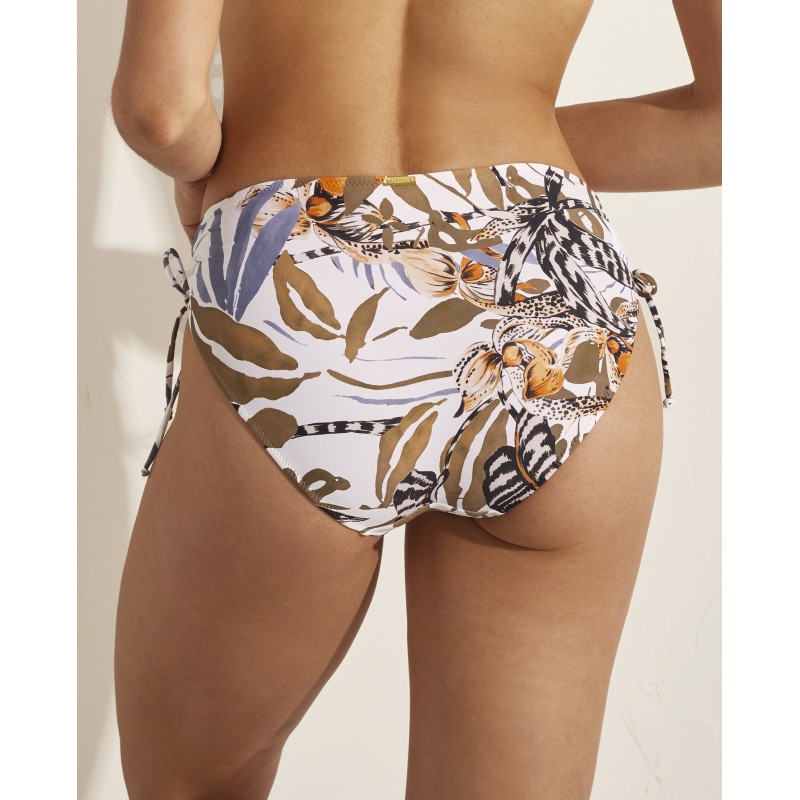 Cueca de biquíni de cintura alta com corte clássico. O seu design capta a energia da natureza, com estampados que o transportam para paisagens vivas e misteriosas da floresta amazónica.