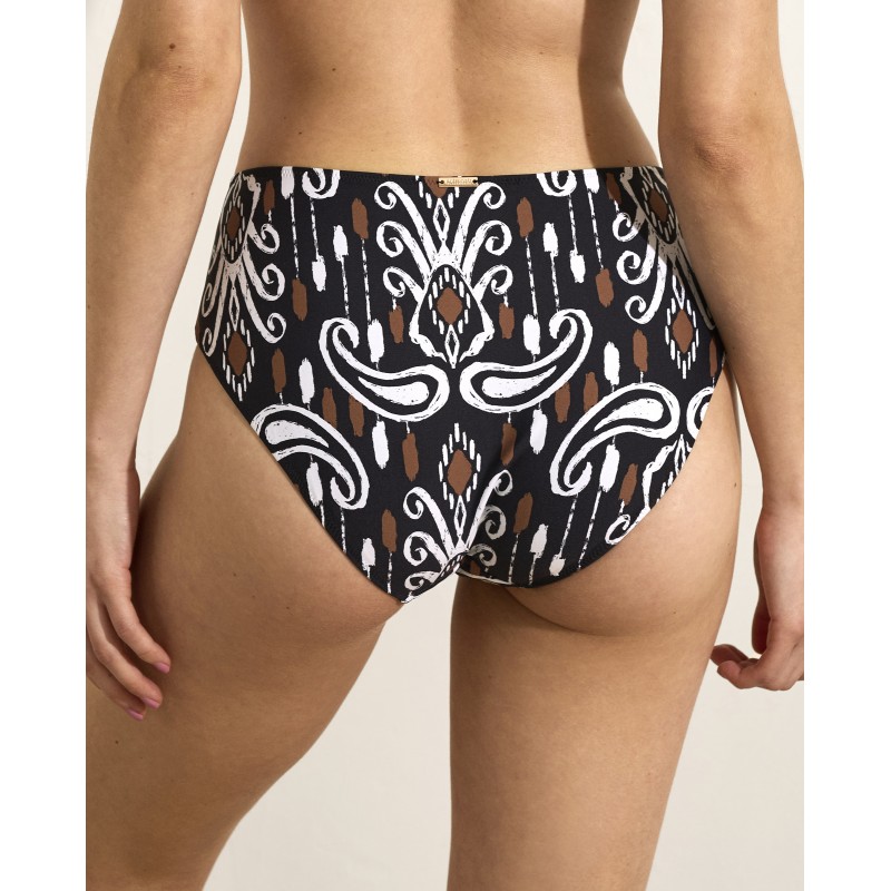 Cueca de biquíni de cintura alta com corte clássico. Deixe a sua personalidade brilhar com este design, onde cada detalhe do estampado conta uma história de cor e elegância.