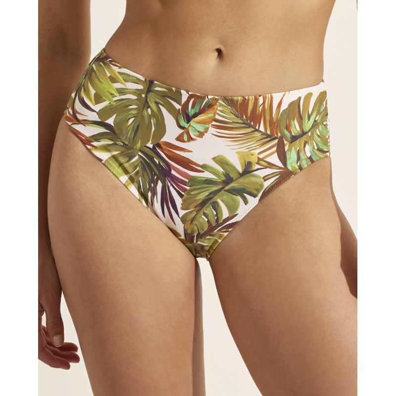 Cueca de biquíni de cintura alta com corte clássico. Transporte-se para uma aventura tropical com este design que o fará sentir-se vivo e cheio de energia.