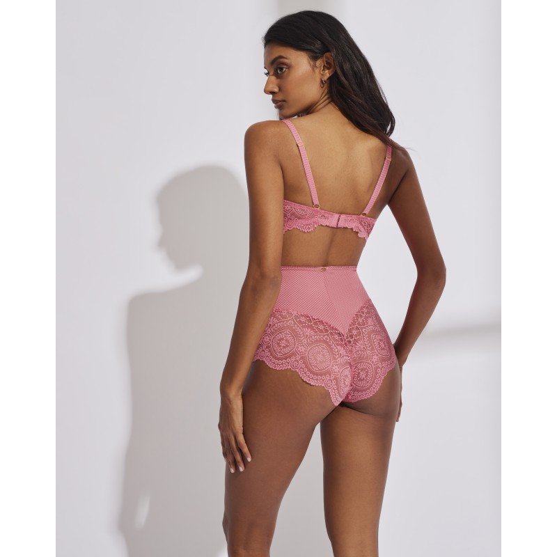 Cuenca clássica muito alta. O seu espetacular desenho em renda confere-lhe um estilo romântico e boémio ao mesmo tempo. Esta peça combina sensualidade, frescura e elegância, ideal para mulheres livres e autênticas.