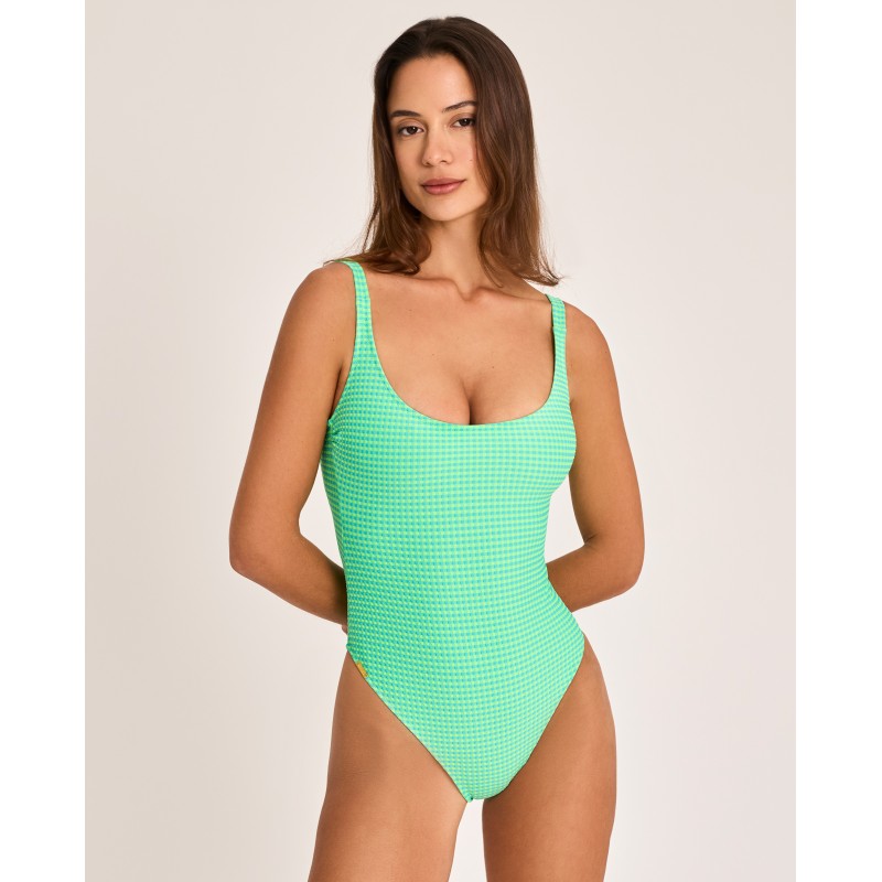 Fato de banho com decote quadrado, sem copa, aro ou enchimento. Com alças ajustáveis. Esta peça, num tom luminoso e delicado padrão entrançado, realça a silhueta de forma subtil e elegante, enquanto o acessório embutido acrescenta um toque de originalidade ao look.