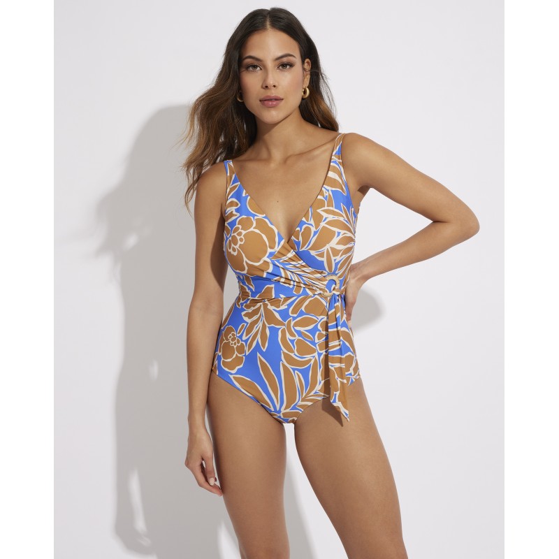 Fato de banho feminino com decote em V. Sem armação e com copo interno de espuma. Com alças largas para máximo conforto. Este design fresco e natural evoca a sensação de estar num ambiente tropical e em contacto com a natureza. É perfeito para usar neste feriado.