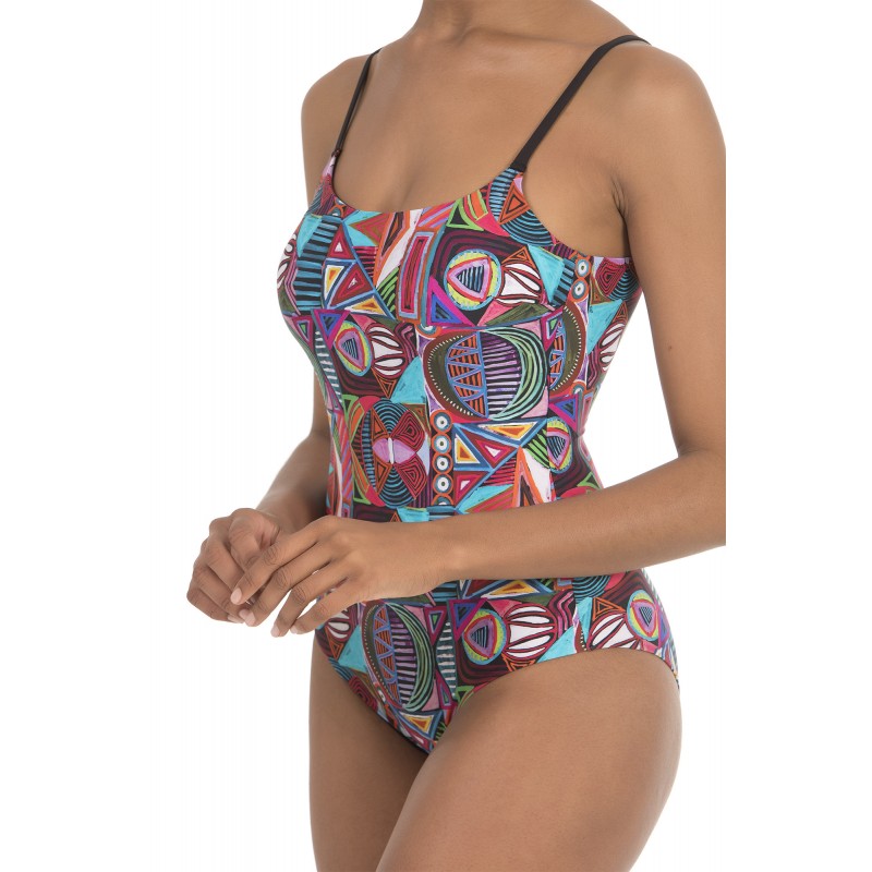 Fato de banho decote alto quadrado. Com copa interior e sem aro. Com estampado tribal. Em preto.