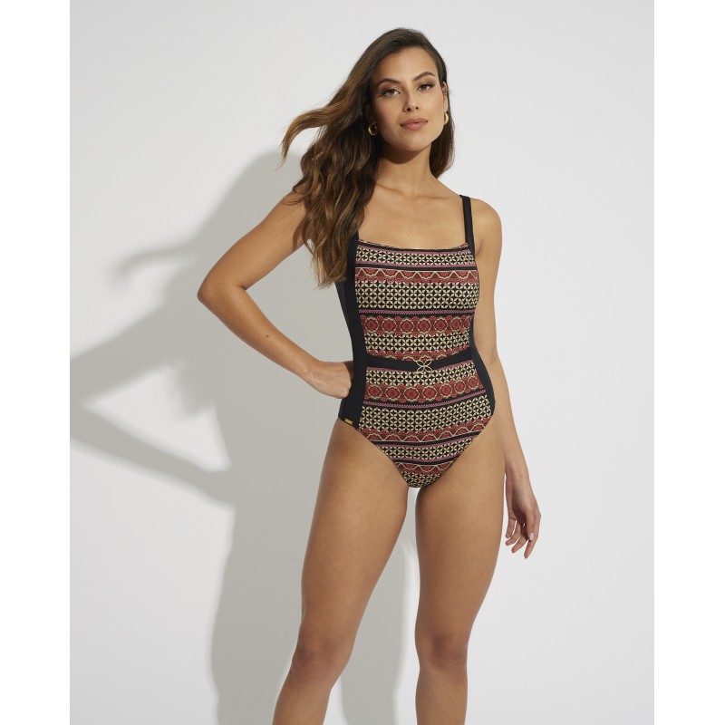 Fato de banho com decote quadrado alto. Com armação e sem copo de espuma. Com um padrão geométrico de estilo étnico inspirado em desenhos tribais e detalhes únicos que lhe conferem um toque autêntico e original.
