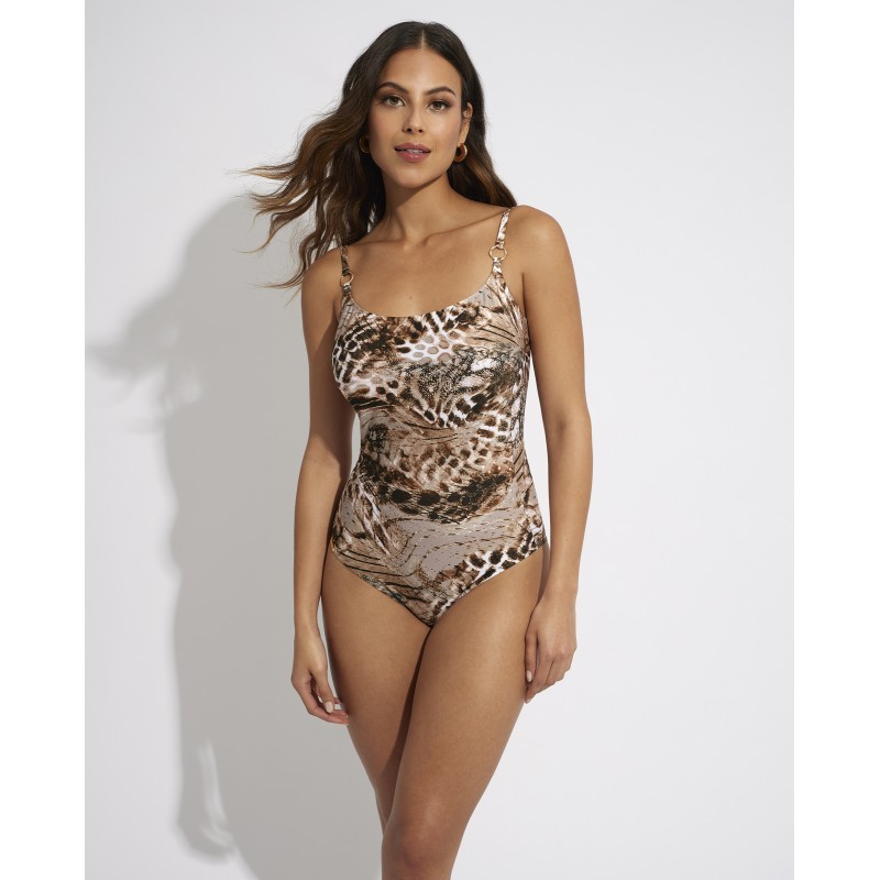 Fato de banho feminino com decote quadrado. Com copo interno e sem anel. Sua estampa selvagem e ousada irá conectar você com a natureza e a beleza da fauna africana. Com detalhes que proporcionam um toque elegante e sofisticado, farão você se sentir único e poderoso.
