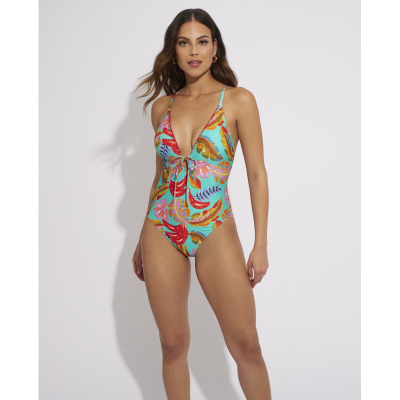 Fato de banho feminino de corte triangular, sem copa interior e sem armação. Com uma estampa colorida e vibrante que vai dar frescor e vida aos seus dias de praia ou piscina.