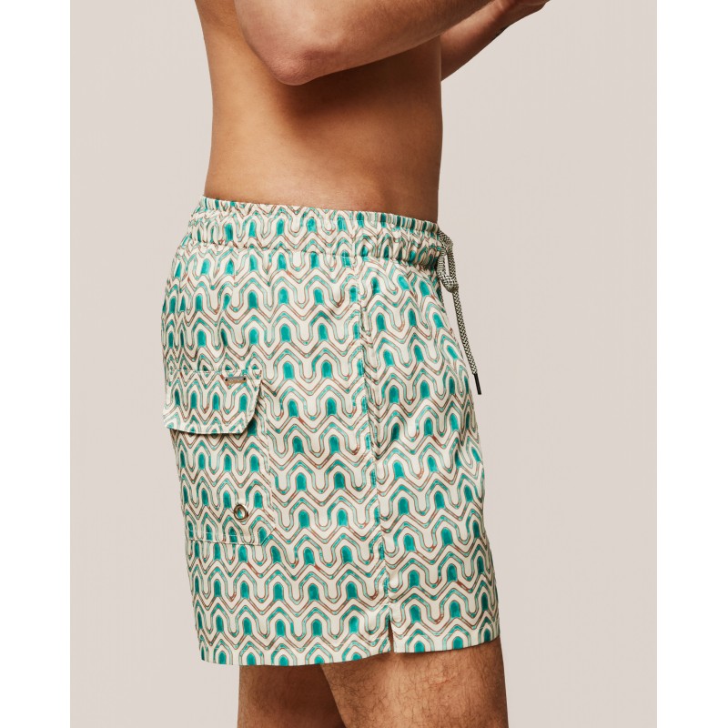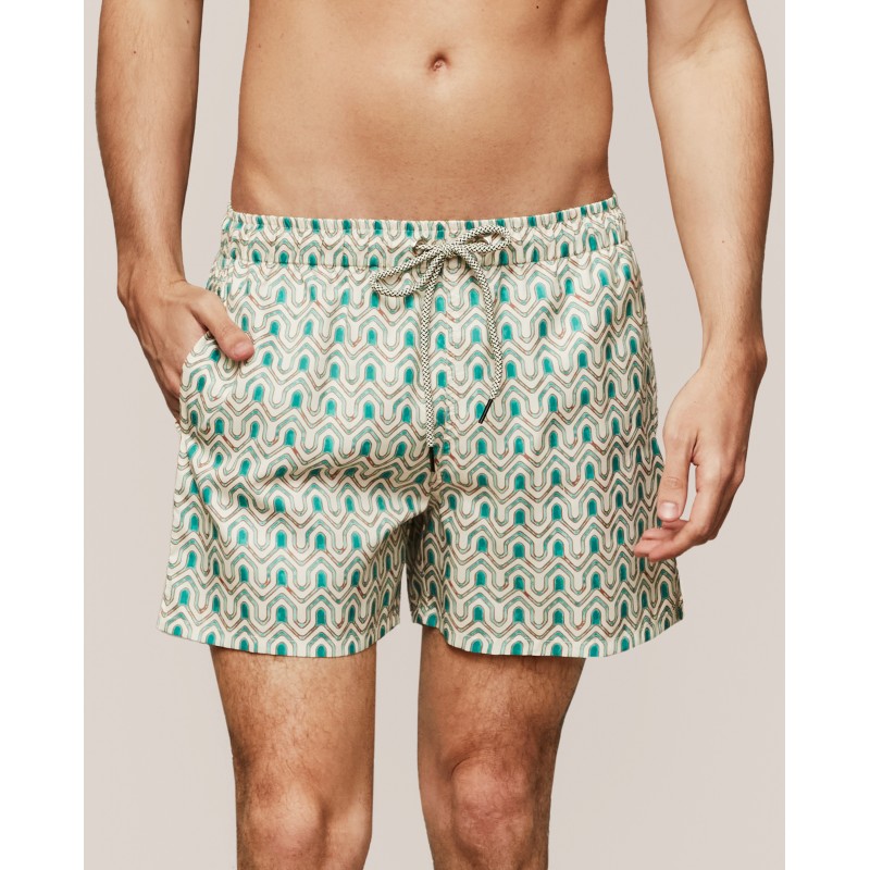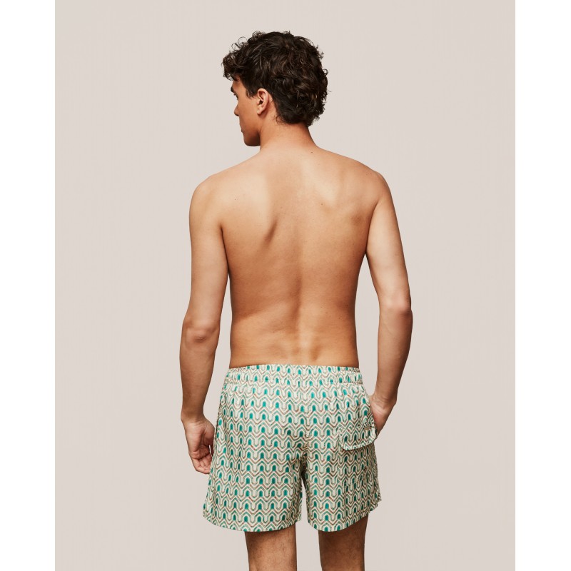 Fato de banho masculino de corte clássico. Apresenta um estampado geométrico que acrescenta dinamismo e um toque de verão. Feita com materiais reciclados.