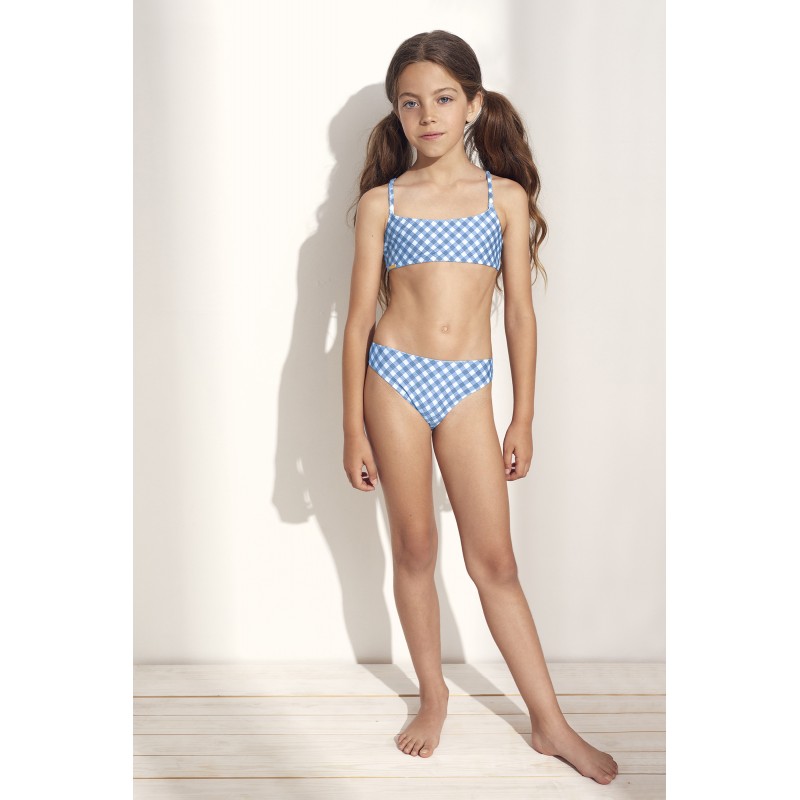 Bikini de menina. Blusa de decote quadrado com alças cruzadas nas costas e calcinha de corte clássico. Com uma bela estampa, ideal para acompanhar toda a família neste verão.