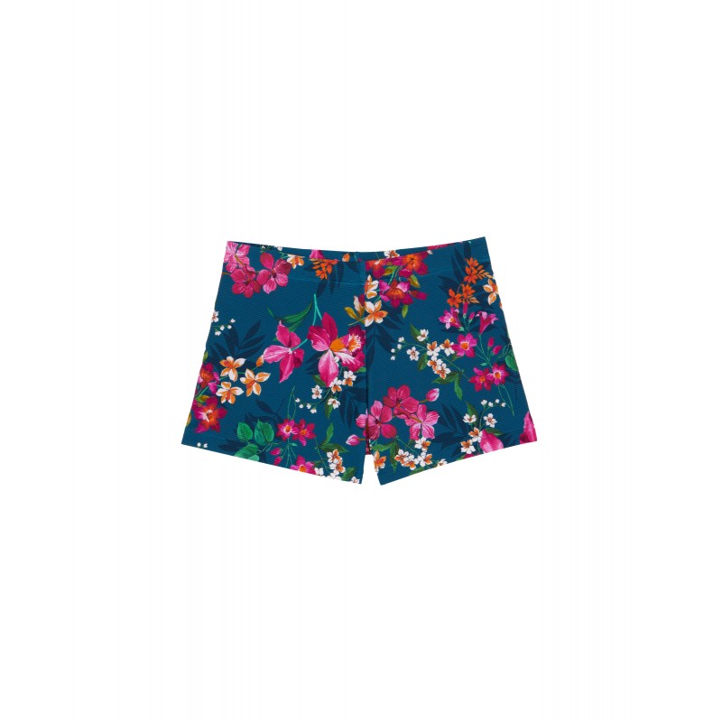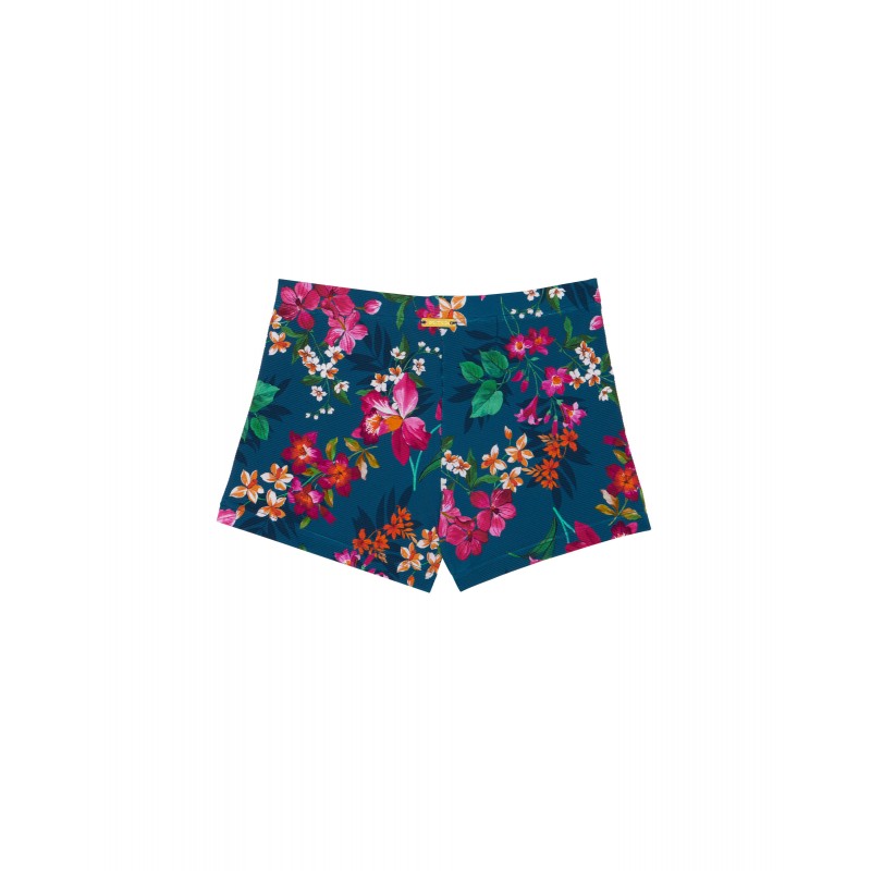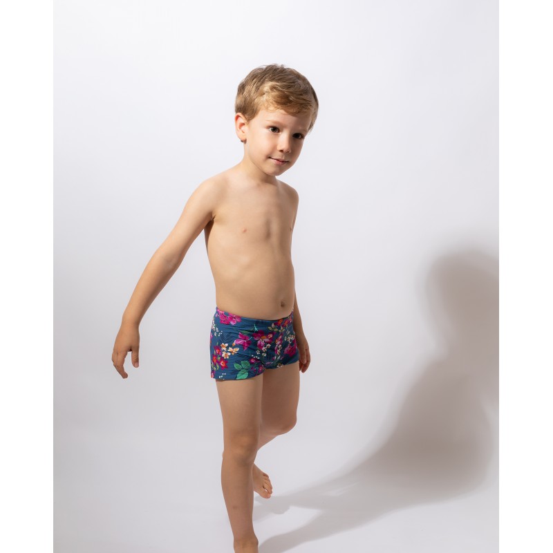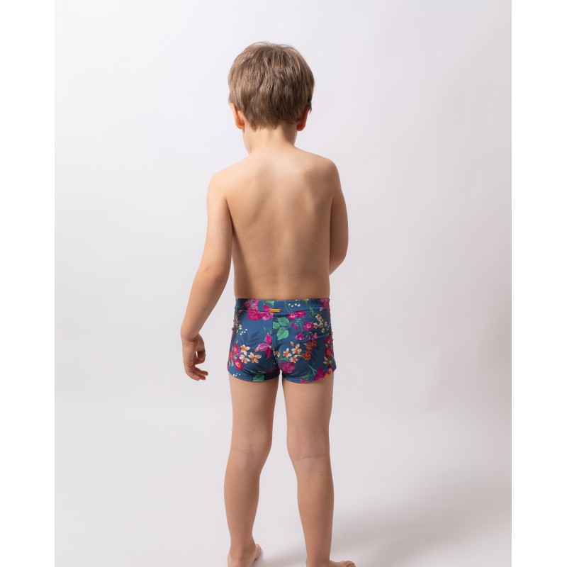 Fato de banho de corte clássico para menino. Com uma linda estampa floral e colorida, ideal para combinar com toda a família neste verão.