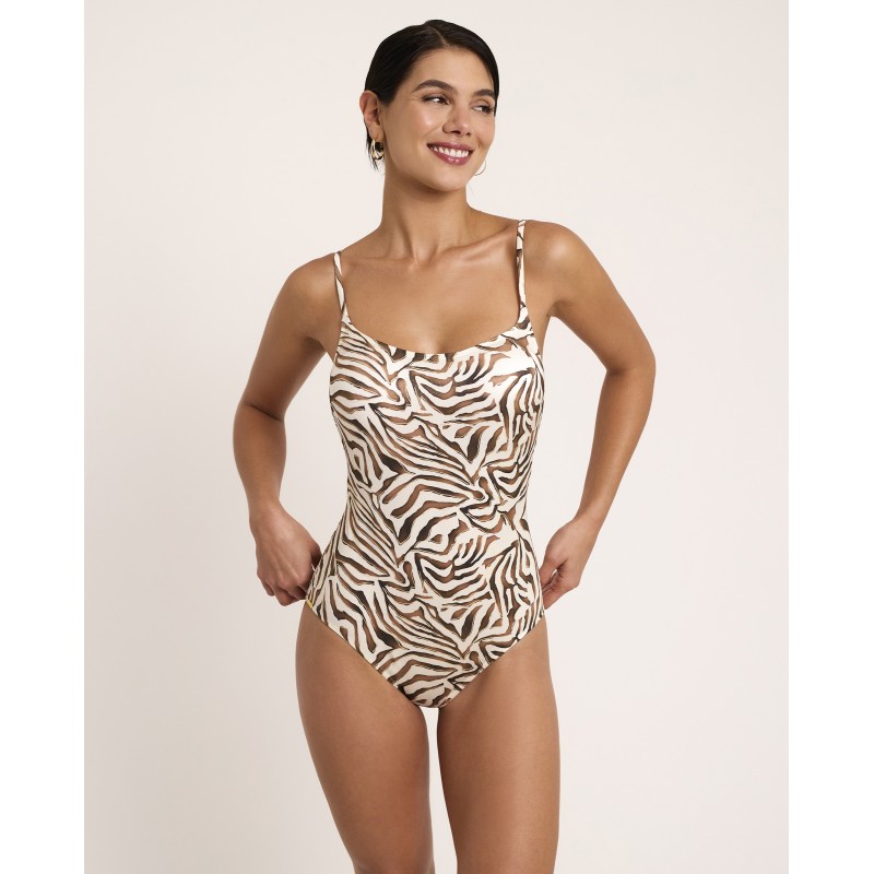 Fato de banho feminino com decote quadrado. Possui copa embutida, sem aro e alças cruzadas. O estampado animal orgânico transmite instinto, força e liberdade, celebrando uma feminilidade confiante e poderosa. Parte da coleção Utopia, onde o impossível se torna realidade.