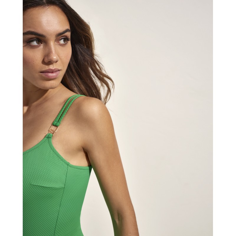 Fato de banho de menina com decote quadrado alto e alças multiposições. Com bojo interior e sem aro. Este design versátil é perfeito para quem quer uma peça que se adapte a uma variedade de ocasiões e estilos. O seu ajuste confortável e seguro permite-lhe desfrutar de atividades aquáticas sem preocupações, seja na praia ou na piscina. É certamente uma opção clássica, prática e elegante para o verão, ideal para estar bem vestida enquanto se diverte ao sol.