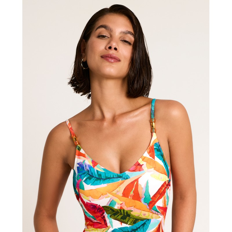 Fato de banho modelador com bojo e sem aro. Com alças ajustáveis ​​em várias posições. Inspirado na natureza exuberante, este estampado tropical é perfeito para banhos de sol e momentos à beira-mar.
