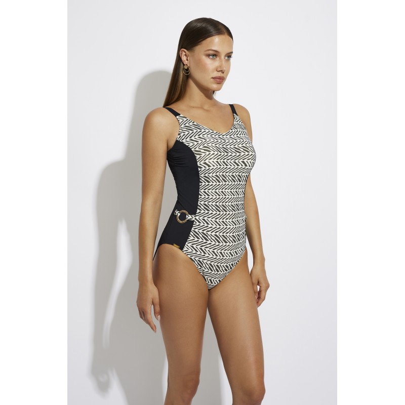 Fato de banho protético com decote em V. Sem aro e com bolso protético interno. Desenvolvido para mulheres que precisam incorporar uma prótese após uma intervenção de mastectomia ou tumorectomia. Decote alto e alças largas para máximo conforto. Com uma linda estampa étnica, ideal para compor um look praia ou piscina discreto e elegante.