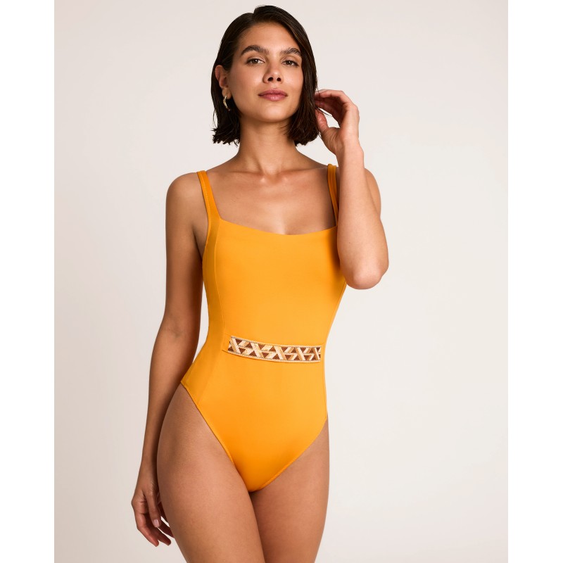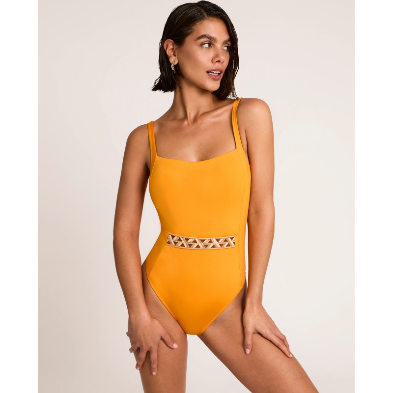 Fato de banho modelador com aro e sem enchimento. Efeito modelador. Uma peça elegante definida pela pureza da sua cor sólida, realçada por detalhes geométricos que conferem personalidade e exclusividade.