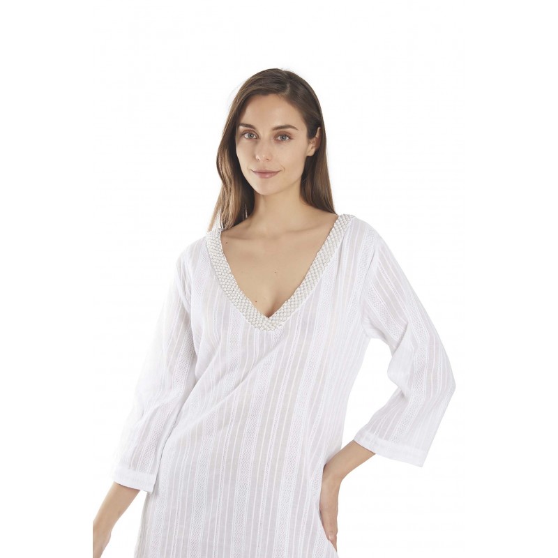 Kaftán de meia manga em tecido fino. Pescoço em V. O detalhe das pérolas à sua volta fazem dela uma peça de vestuário muito especial.