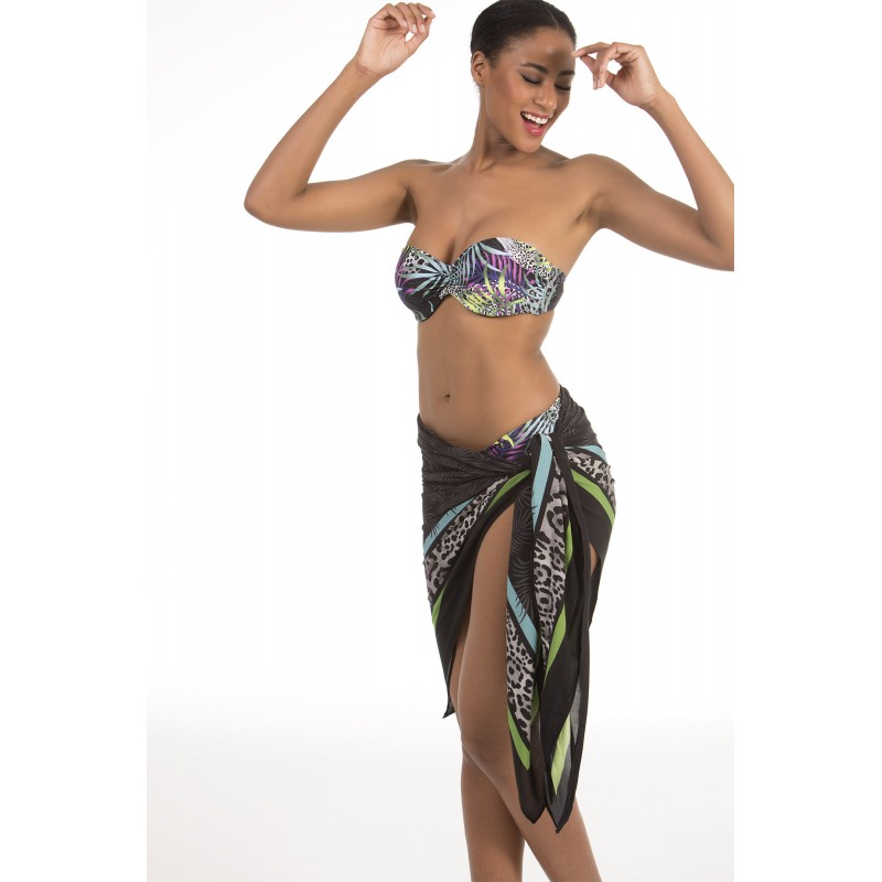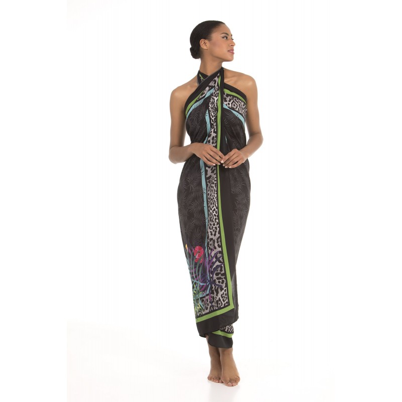 Lenço pareo macio e largo para utilizar de ambos modos. Perfeito para combinar com bikini ou fato de banho. Un designe de estampado vivo. Em preto.