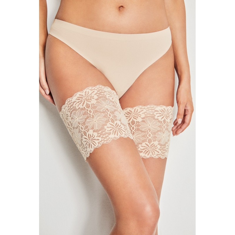 Liga larga para evitar atrito. Fita antiderrapante. Com renda floral. Esteticamente atraente e funcional.