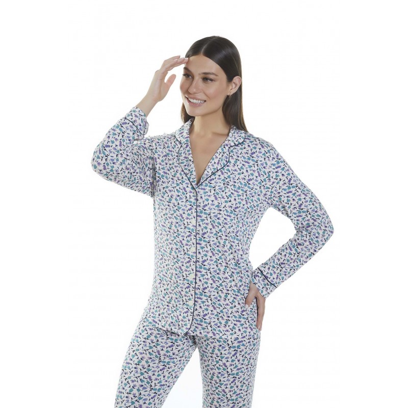 Pijama de camisa composto por calças compridas e uma blusa de corte de camisa. Um design com estampa floral que adiciona um toque de frescura à estação do inverno.