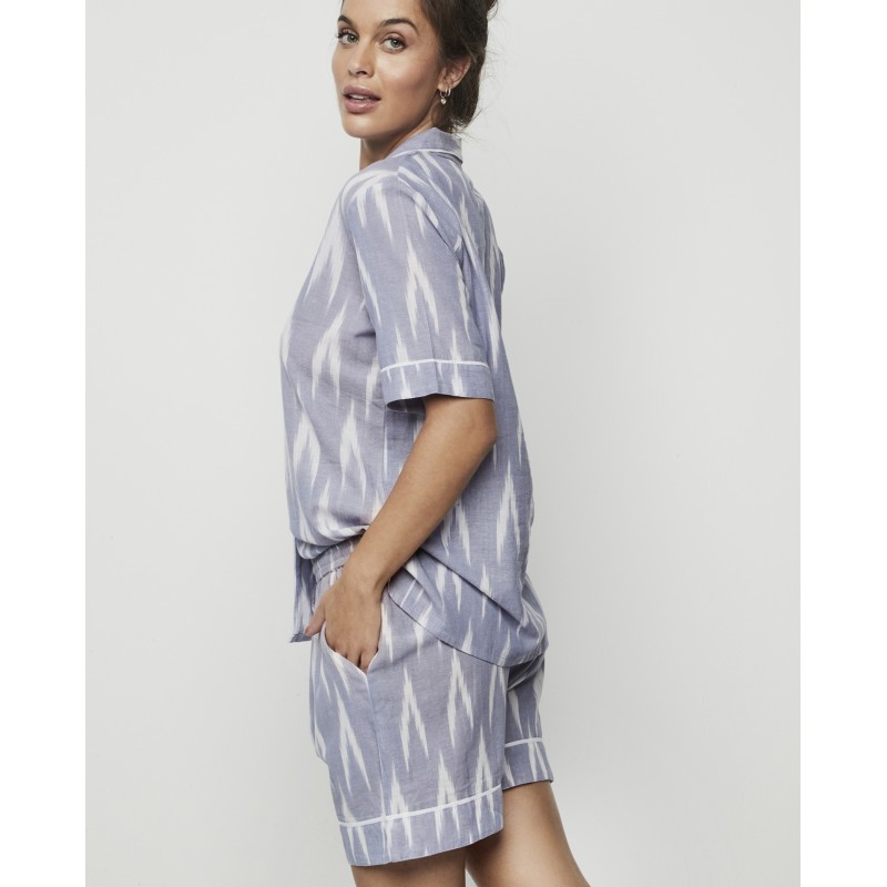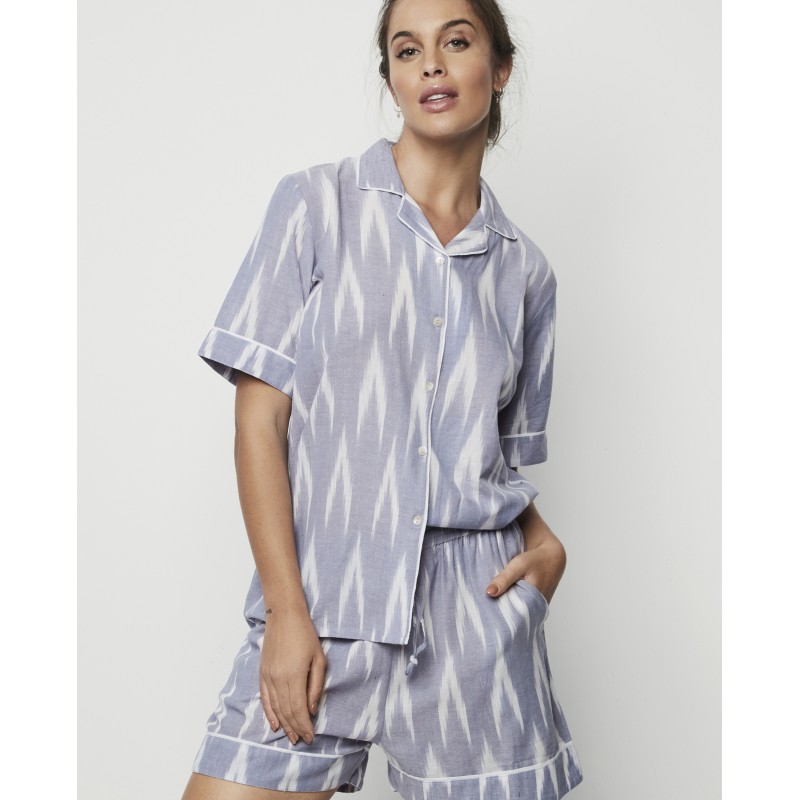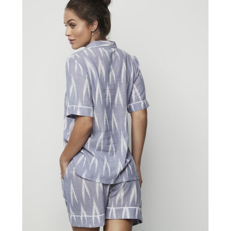 Conjunto de pijama composto por duas peças combinadas 100% algodão: uma camisa de manga curta com fecho frontal por botões, juntamente com calções com cós elástico ajustável. Além de ser uma peça confortável, o seu estampado de estilo étnico torna-a uma peça original que evoca frescura e um estilo muito jovem.