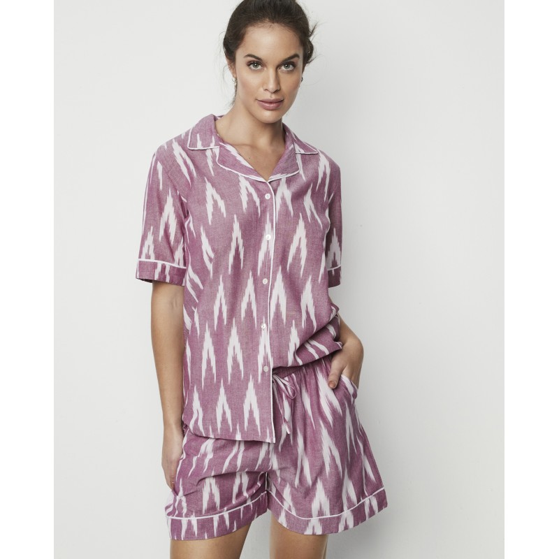 Conjunto de pijama composto por duas peças combinadas 100% algodão: uma camisa de manga curta com fecho frontal por botões, juntamente com calções com cós elástico ajustável. Além de ser uma peça confortável, o seu estampado de estilo étnico torna-a uma peça original que evoca frescura e um estilo muito jovem.