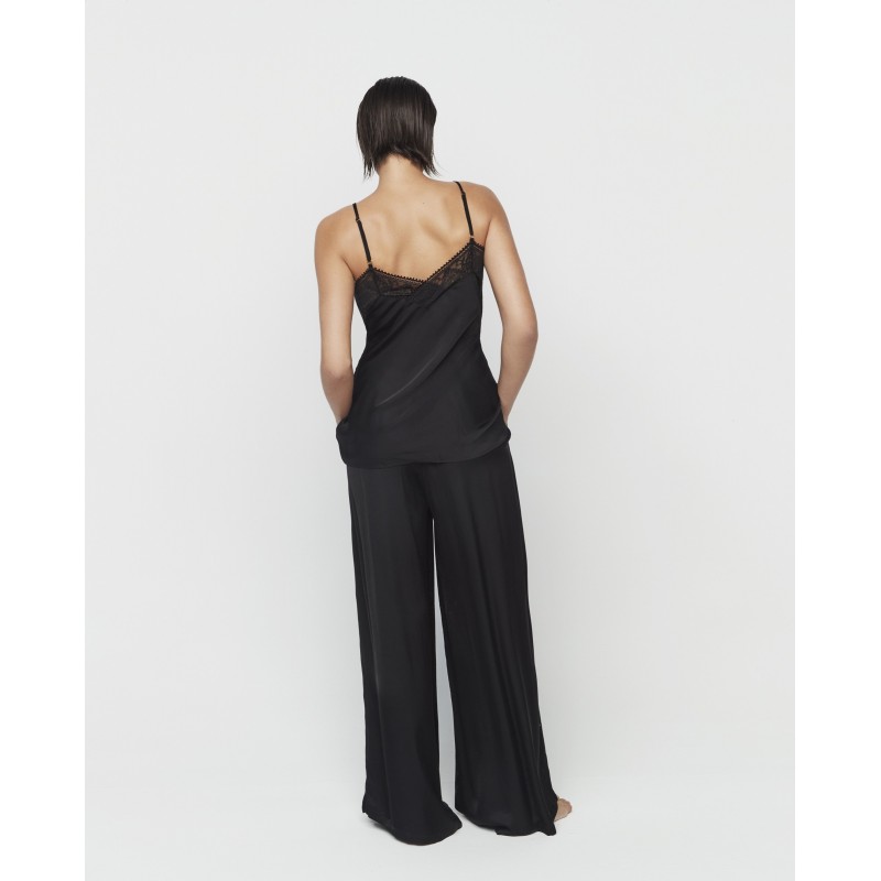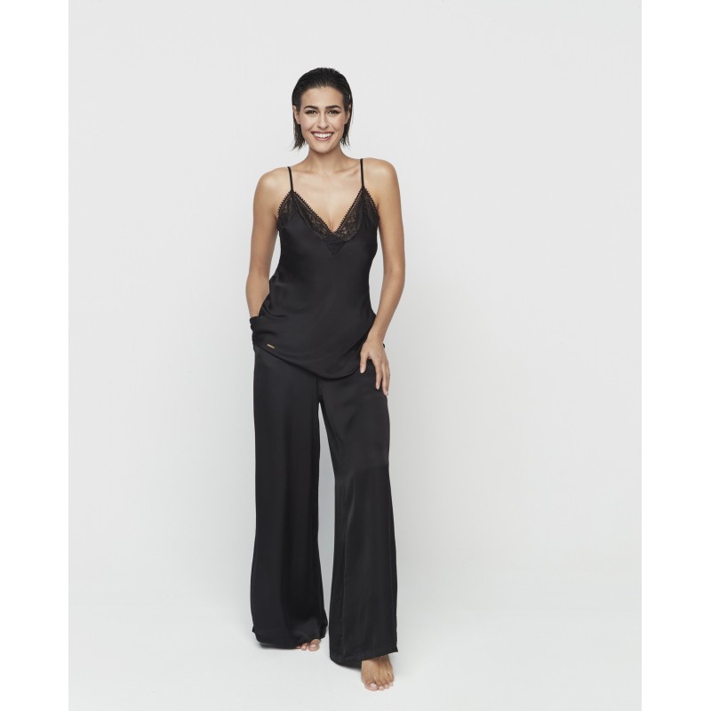 Conjunto de pijama de mulher de duas peças. Inclui um top com alças ajustáveis ​​e calças compridas com bolsos. Um conjunto com cortes impecáveis ​​e acabamentos luxuosos, perfeito para uma noite de sono glamorosa. O seu design faz parte da coleção Aurum, criada em colaboração com Pilar Rubio para celebrar o nosso 50º aniversário.