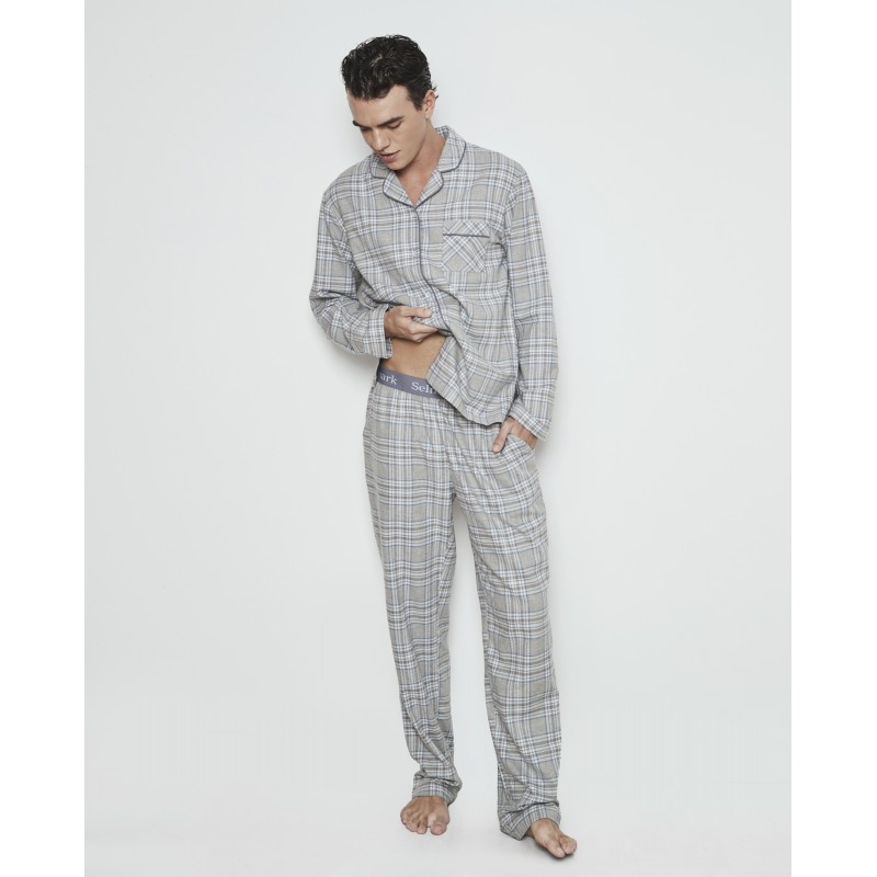 Pijama de homem de duas peças. Com blusa estilo camisa com botões à frente e calças compridas com bolsos na parte inferior. Com um estampado xadrez intemporal, este pijama combina estilo e conforto para as suas noites tranquilas.
