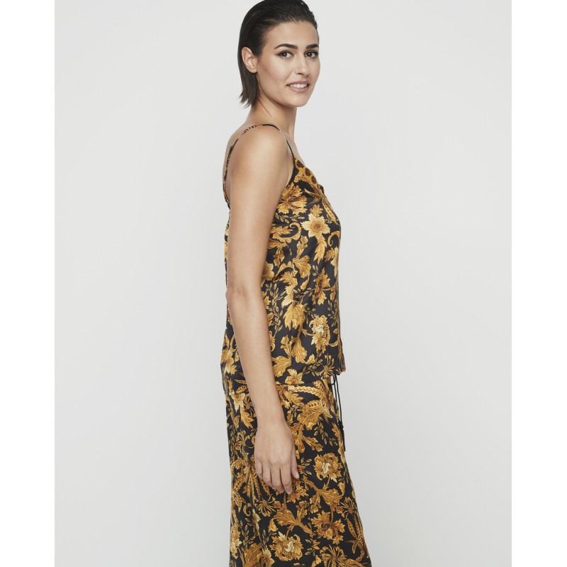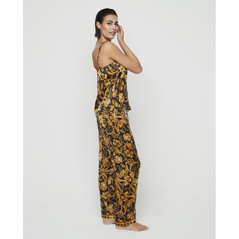 Pijama de senhora de duas peças. Inclui uma camisola de alças e umas calças, além de calças compridas de corte clássico. O seu estampado refinado e luminoso adiciona um toque único e pessoal ao seu look noturno.